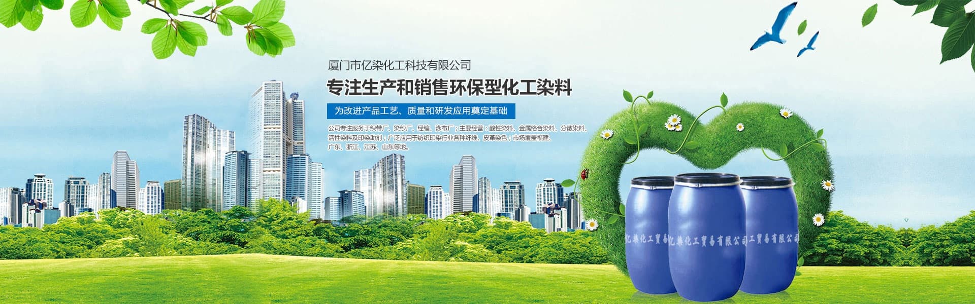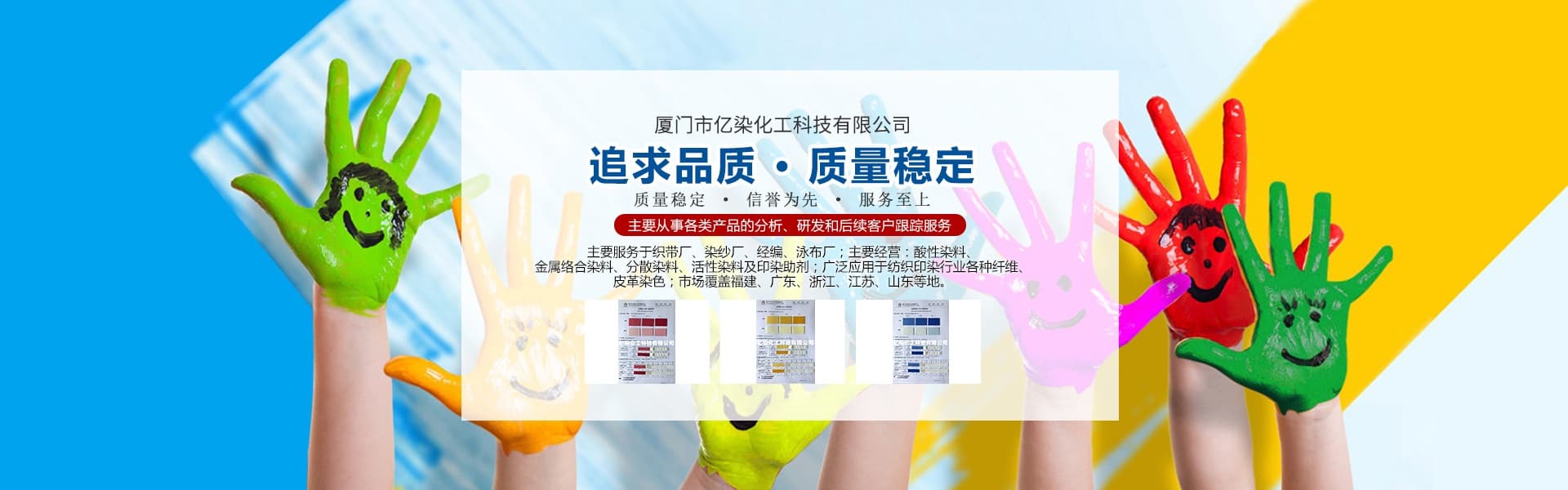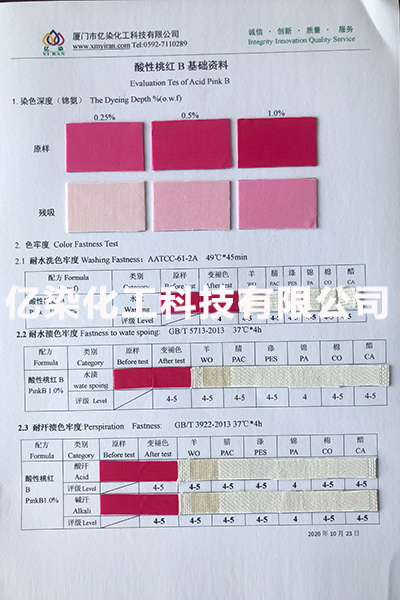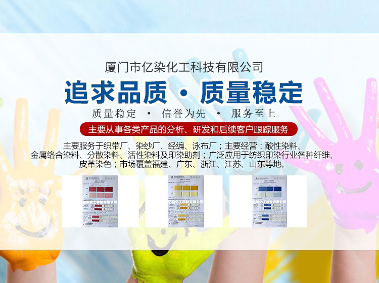 廈門市億染化工科技有限公司是一家集研發(fā)、生產(chǎn)、銷售一體的綜合型企業(yè)。公司主要經(jīng)營:酸性染料、金屬絡合染料、高牢度分散染料及印染助劑。公司信守“以誠信贏合作、以質(zhì)量贏市場、以創(chuàng)新贏發(fā)展、以服務贏生存”的企業(yè)精神服務于廣大客戶,多年以來建立了良好的市場口碑,市場遍布福建、廣東、浙江、江蘇、山東及東南亞國家,與多家知名企業(yè)建立了長期合作伙伴關(guān)系!